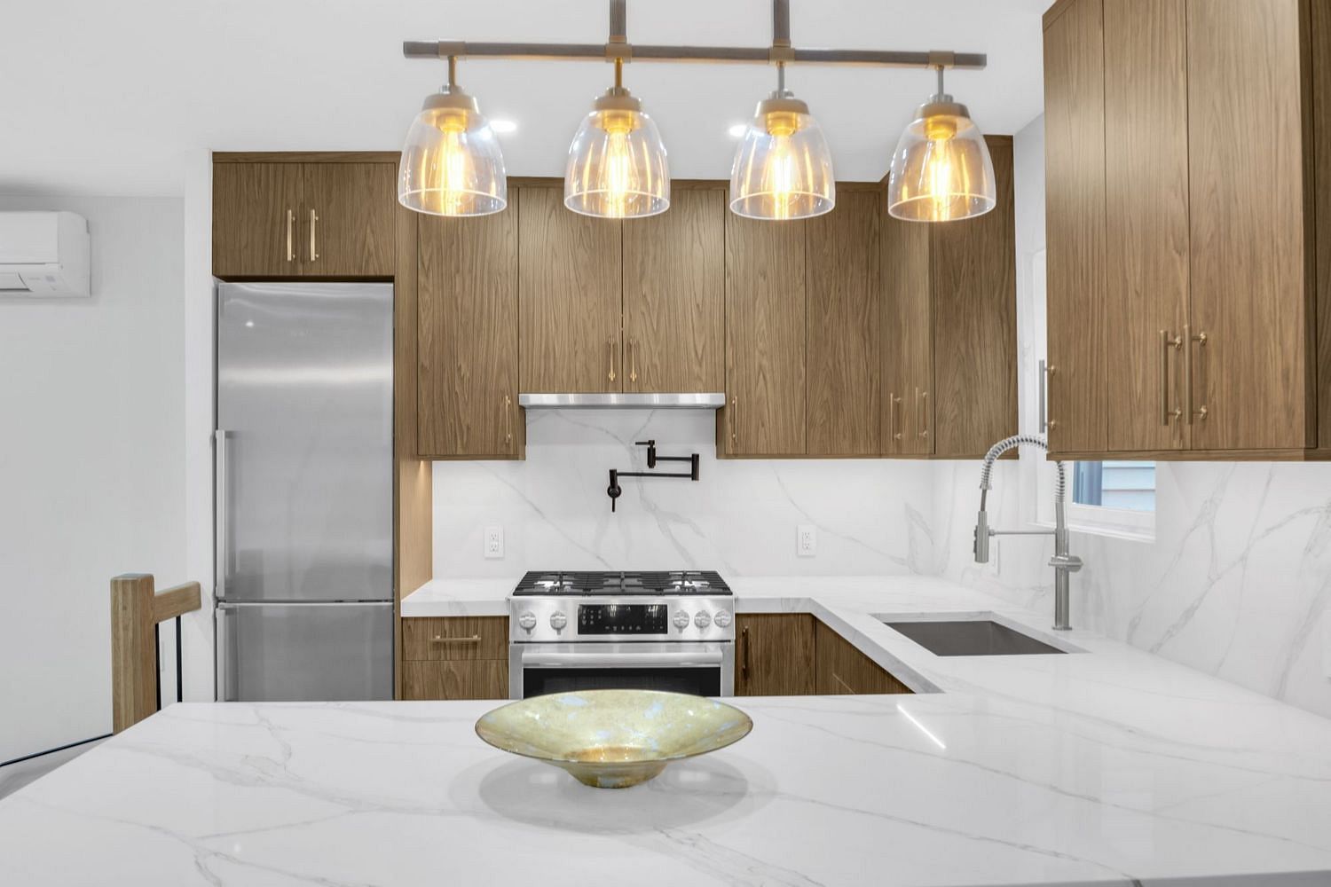 Featuring Contempory Open Concept Living Space . Chef's Kitchen with 6 Burner Stainless Stove and Pot filler. Calacatta Gold Counters and Backsplash W/ Huge waterfall Breakfast Bar.