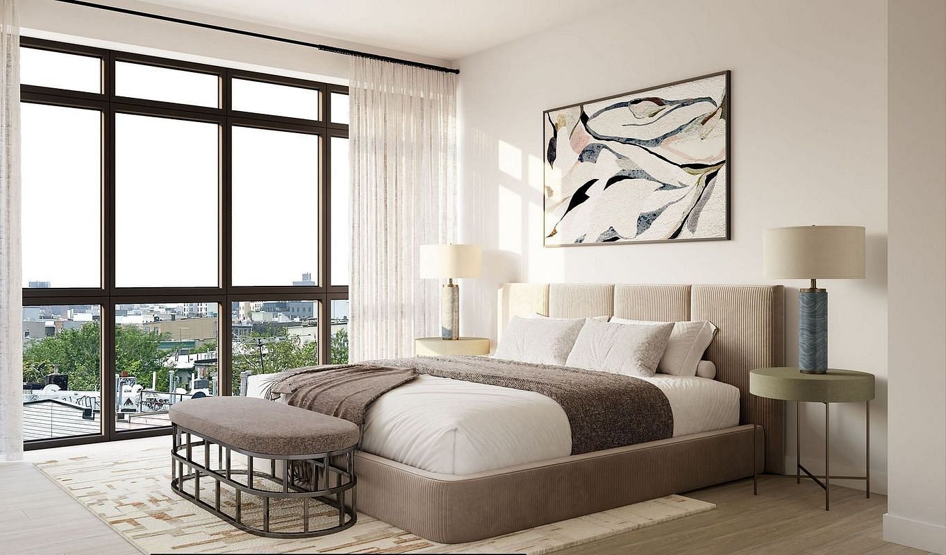 Residence 2A is a thoughtfully designed two-bedroom, two-bath with open living and dining concept, framed by oversized windows that bring in abundant natural light with a treeline view, while the modern kitchen features European-style cabinetry, Bosch appliances, and Caesarstone countertops. Bedrooms are well-proportioned with generous closet space. Spa-inspired bathrooms feature heated floors, Calacatta porcelain tile, walnut-finished vanities, and premium fixtures. In-unit washer/dryer, central heating and cooling, and smart-lock entry complete this refined Bushwick residence.