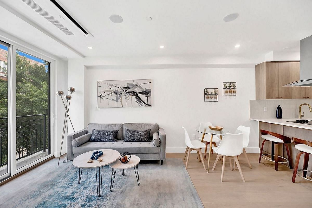 Welcome to 156 Tompkins Ave, a brand-new boutique condominium in the heart of Brooklyn, offering eight thoughtfully designed residences featuring 1-bedroom plus a spacious study room. Each home showcases engineered wood flooring, a Juliet balcony, and a modern open-concept kitchen with a sleek island and stainless steel appliances.
