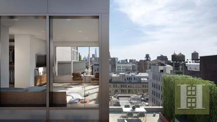The dining area which features a separate full bar island, opens into a stunning, glass walled living room with magnificent north, south and west exposures. Outside you will find a truly magnificent landscaped private roof deck with 360 degree views of New York City. Entertain in style with a 6-person hot tub, outdoor shower, built-in kitchen with grill and a custom designed gas fireplace.