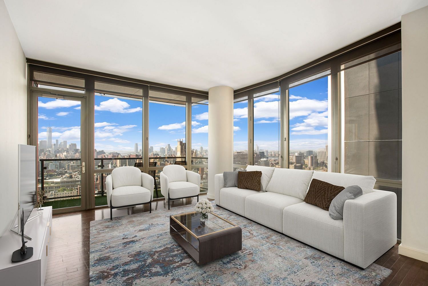 Welcome to Chelsea Stratus, where luxury living reaches new heights! This stunning high-floor corner residence offers an abundance of natural light and breathtaking views. Enter through a welcoming foyer into a spacious living room that showcases panoramic vistas of the Manhattan skyline and Hudson River. Every room is adorned with floor-to-ceiling windows, creating an airy atmosphere complemented by soaring ceilings.