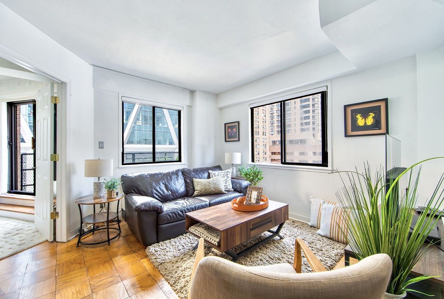 Charming high floor one bedroom with sliding glass doors to the outdoor space as well as eight windows. Open city views north to the Hearst Tower and east to Carnegie Hall and beyond. Corner apartment with hardwood floors, windowed kitchen and windowed bath, both previously renovated, and large closets.
