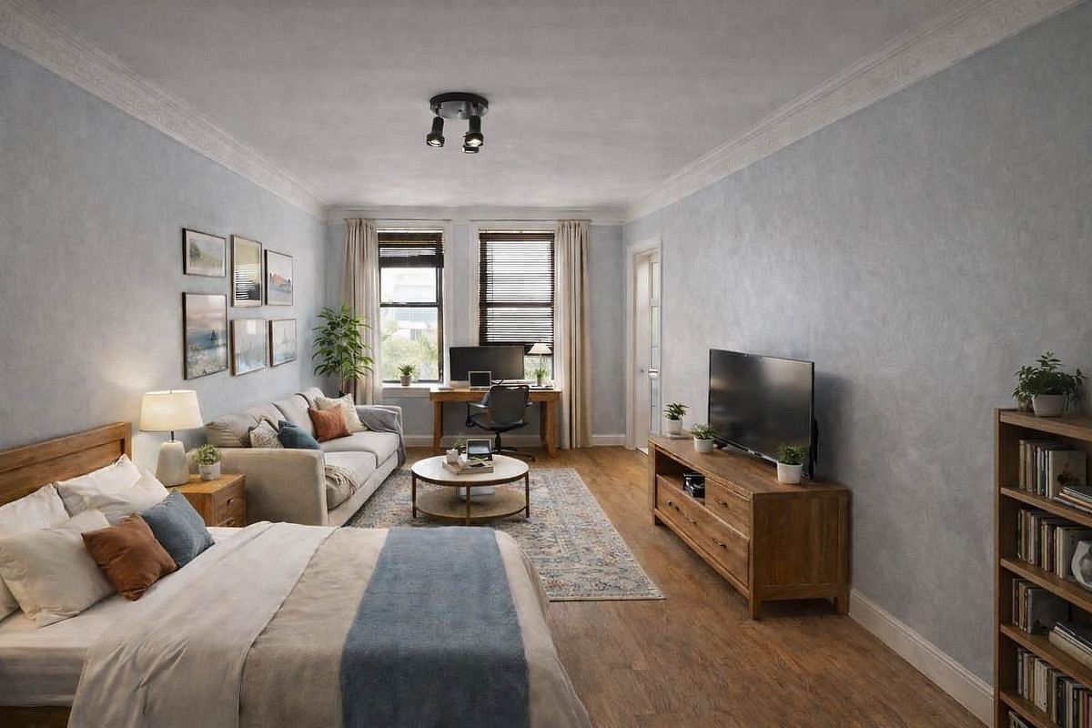 The apartment features a generously sized living space that can easily accommodate distinct areas for living, sleeping, and working. Multiple windows bring in natural light and enhance the sense of openness throughout the main room.