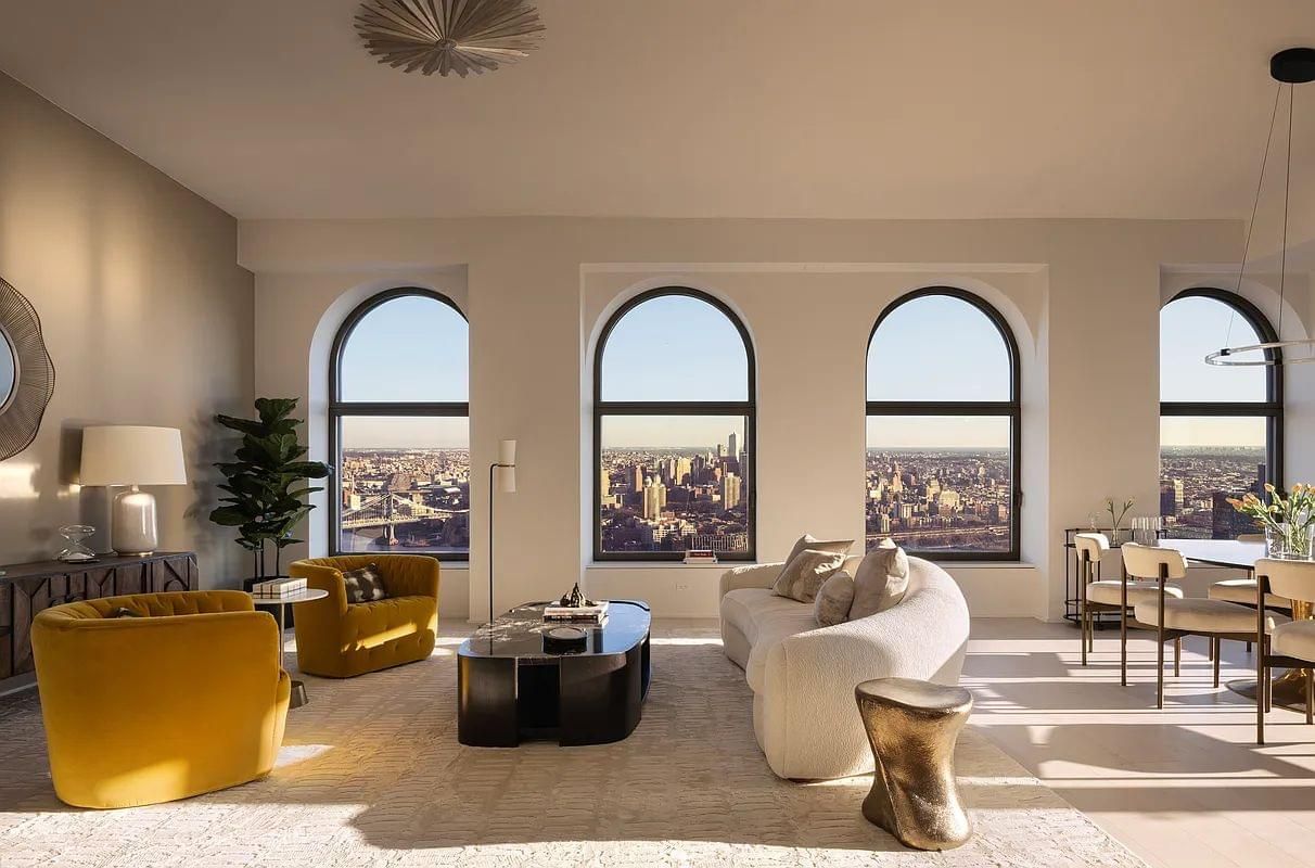Penthouse 64B is a three bedroom, three-and-a-half bathroom home featuring ceilings up to 11 feet and a generous private outdoor space. Oversized arched windows with elegant bronze detailing frame panoramic river and New York City skyline views on all sides. The outdoor loggia spans the full width of the residence, reaching nearly 80 feet. Interior finishes include wide-plank white oak flooring and oil rubbed bronze fixtures custom designed by Sir David Adjaye. The living and dining area with direct loggia access boasts an open kitchen with custom Pedini Italian textured blackened oak cabinetry with blackened steel insets and Salvatori Pietra Cardosa marble countertops and backsplash hand-selected from the Apuan Alps in Tuscany with a Salvatori Nero Marquina cantilever providing additional seating. State-of-the-art appliances by Gaggenau and Thermador include a fully-vented hood, double oven, and wine storage. The corner master bedroom suite enjoys direct loggia access and includes two walk-in-closets and a luxurious bathroom with textured Salvatori Italian Bianco Carrara marble with a Grigio Versilia slab wainscot, carved stone 6-foot soaking tub with skyline views, carved stone sinks, separate water closet, and oversized shower. There are two generous secondary bathrooms in the residence with custom Pedini Italian millwork vanities, one complete with Salvatori Grigio Versilia marble throughout and a soaking tub, the other with Salvatori Bianco Carrara marble throughout and an expansive shower. A powder room off of the entry foyer is designed with Grigio Versilia marble with a textured bamboo finish and a Salvatori Italian walnut sink with a Grigio Versilia basin. A separate utility room offers a washer, fully-vented dryer, and sink.