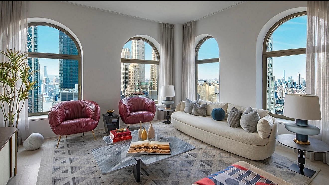 Residence 51D is a corner three bedroom, three bathroom home with approximately 10 foot ceilings and oversized arched windows with elegant bronze detailing framing expansive New York City skyline views.