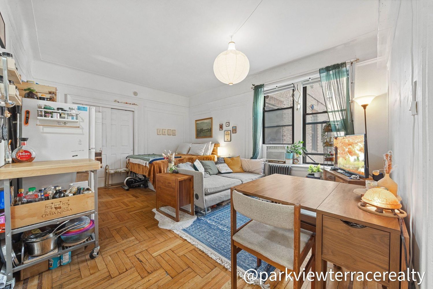 Located on the first floor of a well-maintained, low-rise coop building, this bright and airy studio features classic hardwood floors, generous natural light, and a thoughtfully updated open kitchen with sleek appliances. Whether you're cooking, relaxing, or working from home, the open layout offers flexibility and comfort.