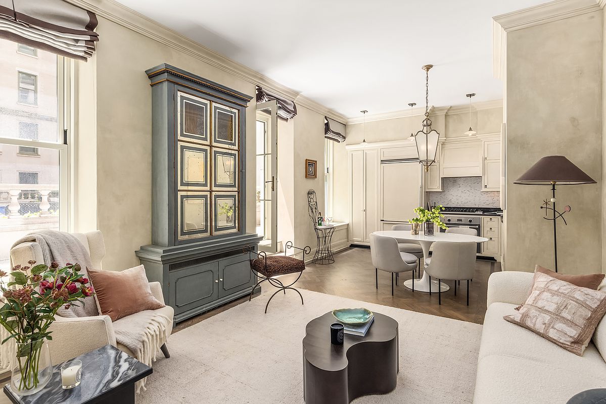 Inside, 12-foot ceilings with crown molding, herringbone wood floors, and abundant southern light create an airy, elegant feel. The custom kitchen features Nero Marquina marble counters, Calacatta marble tile, and premium Viking and Miele appliances. Central AC, automatic shades, and an in-unit washer/dryer provide modern comfort.