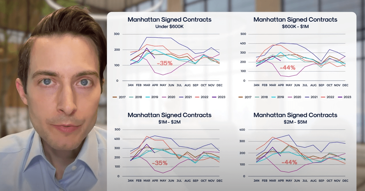 Hey everyone, this is James at Yoreevo, New York's #1 commission rebate brokerage with our April 2023 Manhattan Market Update. And we saw a rapid deceleration or a rapid slowdown versus the surprisingly strong results that we saw in March. So first on a headline basis, sales are down 39% compared to last year, that was 22% in March. And then if we compare it to the 2017 to 2019 average, we were down 16% instead of a 13% increase in March. So no matter how you slice it, a big slowdown, and you can see that in the chart here. Normally throughout the spring for the first five to six months of the year, you see a slow grind up in contract activity. And we did see that up until March and then a big deceleration. So we're not seeing this in our business. I'm not really sure - I don't have anything specific to point to. Maybe it's just people got a little over excited in March and that pulled forward demand and so we should normalize March and April, but in any case, these are the numbers, big deceleration. And it makes the main number, which is usually around the high point for the year, especially important to set the tone for the summer and the rest of the year. When we look at the contract activity by price point we're down about 40% across the board. Doesn't really matter which price point you look at. And this is just that chart that we introduced last month, I think it was, where you can see that we're up 13% compared to normalized demand and now we're down 16% so big deceleration. On inventory, this has been the same boring story for the last nine or ten months, no change. We were up 2% and all year we've just tracked last year's levels, so supply is still very much under control. When you look at this by price point, there's less supply at the lower end, more supply at the higher end, and the higher end is a little bit weaker. But generally it's the same story across the board no real stories by price point. And for mortgage rates, we didn't lead with that this month because it was an incredibly boring month for all rates. You can see here that more trades didn't really move. The Fed rate literally didn't move and because of that, spreads didn't really move. This is that chart that we were talking about last month showing higher than normal mortgage spreads. So very boring month, which I guess is good news. Low volatility is generally good for risk appetite, which maybe will close this gap over time. But in any case, a very boring month for mortgage rates. I know this is the Manhattan Market Update, but it just bears mentioning that we're starting to see some deals in Brooklyn happen at prices and with urgency that I just wasn't seeing even just two three months ago. So it seems like the urgency is really starting to pick up in Brooklyn. Maybe that's due to, well it's always been a stronger market since COVID, also lower inventory, but maybe it's a precursor for things that we're going to see here in Manhattan. I don't know, they're a little bit different markets. But it just bears mentioning that Brooklyn is seeing some very frenetic deals happening. So thanks for watching. Obviously if you're looking for help with your purchase, we'd be happy to help and get you a commission rebate for up to 2% of the purchase price. We'd be happy to slice and dice this data in whatever way is most useful for you. And of course, if you just have any questions whatsoever, you can just reach out to us at info@yoreevo.com. So thanks for watching and we'll see you next month, bye.