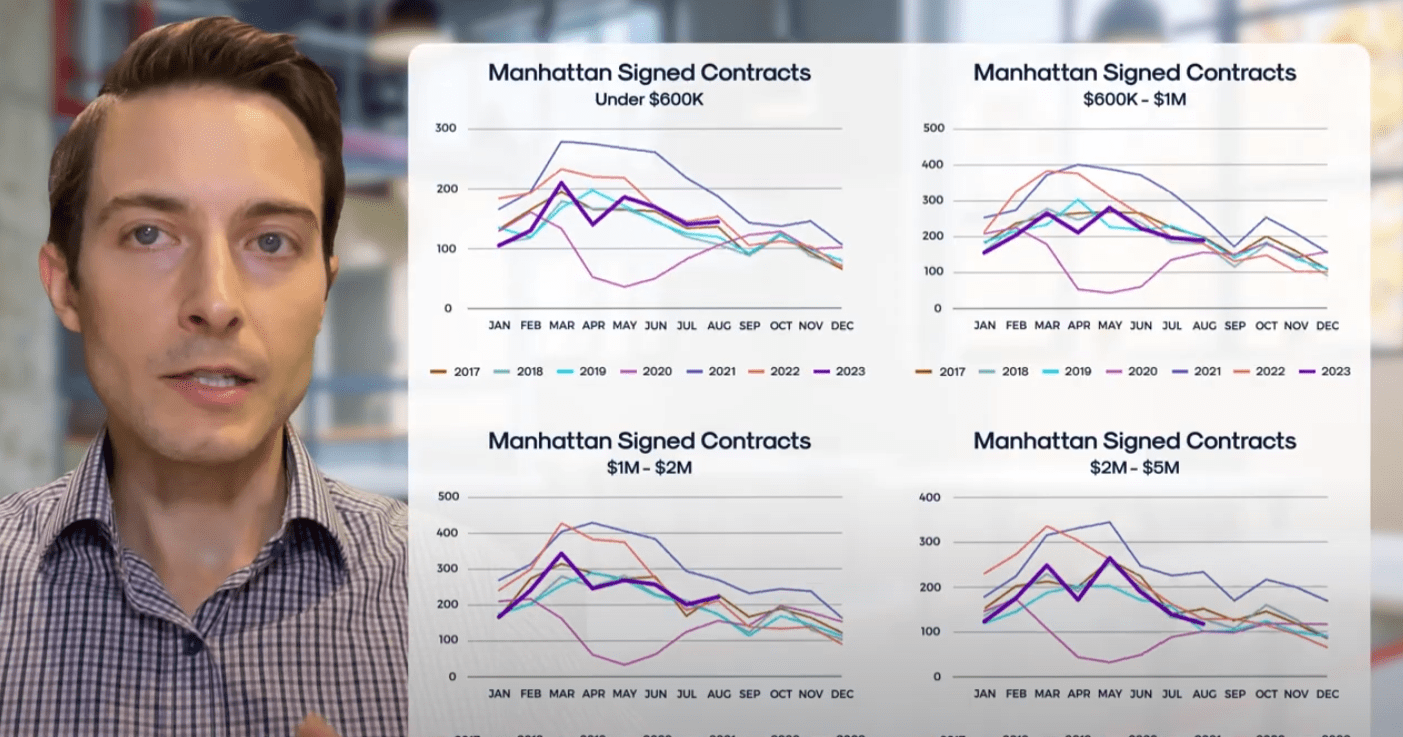 Hey everyone, this is James at Yoreevo - New York's #1 commission rebate brokerage, with our August 2023 Manhattan Market Update, and August is a slow time of the year. It's basically August and December where we have the lowest level of activity for the year, so this is going to be a very quick and simple market update. But when we look at contract activity, we are about flat versus both last year and normalized levels of demand. Normalized demand being 2017 to 2019's average. When we look at this by price point, no real discernible trend. It's up a couple percent, down a couple percent, bounces around. And then this is looking at contract activity to that normalized demand, and for the last six months or so we've been bouncing around flat. inventory continues to bleed lower. We're down about 5% at the end of August. But again, not the most important data point because not many sellers list in August. They save their listings for after Labor Day when buyers are back. So when we're sitting here a month from now, we look at inventory levels, it's going to be a much more important, a much more relevant data point, and really dictate the market going forward because we have two offsetting factors in the market right now that are really setting the tone on pricing, or not setting the tone on pricing. You have lower inventory and you have higher mortgage rates and they're basically canceling each other out. So we're not seeing too much on pricing. So if either one of those were to break, that's really going to dictate where the market heads in the future. So unlike contract activity we do have a trend on inventory by price point, the lower you go on inventory, the lower your own price point, the less inventory there is. And then touching on mortgage rates, we're at the highs. 7% is the new normal and that's with The Fed not doing anything to The Fed Funds Rate. So again, your monthly reminder: The Fed Funds Rate does not impact mortgage rates directly. Mortgage rates are 7%, 7%+, 7.25%. That's kind of the new norm, and it's not really to turning buyers. Again, to our surprise there's just not much inventory out there, so buyers are buying what they can. We hope everyone had a nice summer. If anybody's looking to search and get their search started in the new year you can let us know info@yoreevo.com. We can talk about your search. We can slice this data however you like, and, of course, we can get you a commission rebate for up to 2% on any property in New York City. So thanks for watching and we'll see you next month, bye.