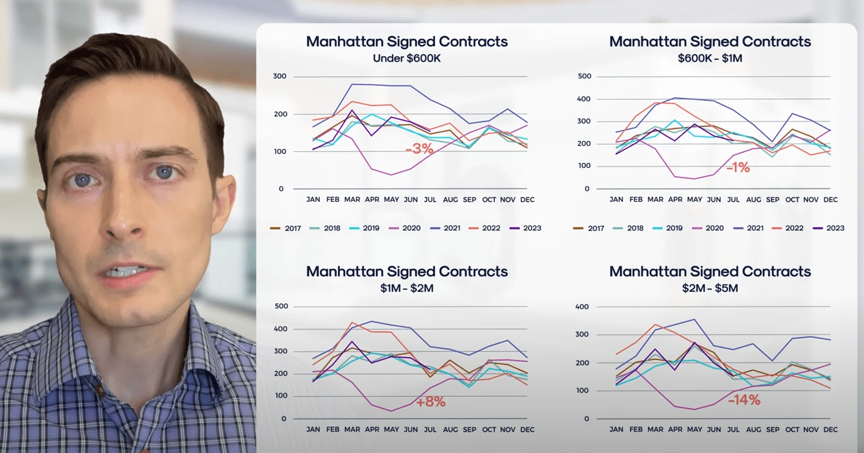 Hey everyone, this is James at Yoreevo, New York's #1 commission rebate brokerage, with our July 2023 Manhattan Market Update. And it's the summer, it's July, so there's not as much going on, but basically the trends that we have been watching for the last couple months, and have been expecting for the next couple months, have continued. When we look at the level of contract activity, we're up about 1%. That's our first increase on a year-over-year basis this year. That's not as noteworthy as it sounds because remember, comparisons get easier throughout the year because mortgage rates rose throughout last year, but it's an increase nonetheless. When we compare to the 2017 to 2019 average, which we considered to be normalized levels of demand, we are also up a couple percent. When we look at this by price point, nothing too noteworthy here, just kind of bounces around on a month-to-month basis. And then this is looking at recent demand versus that 2017 to 2019 average, you can see since February, we've been bouncing around flat. Inventory continues to be the bigger driver of the market. We continue to see larger declines there, which is supporting pricing, because buyers don't have as many options so they have to be a little more aggressive with their offers to scoop up the offers that are out there. The big test is going to be after Labor Day, because a lot of sellers hold their listings off the market in July and August and put them on the market after Labor Day when buyers are back. So in two months when we're doing the September Market Update that'll be a much more significant data point, but for now low inventory continues to support pricing. When we look at this by price point, there is a trend here. Basically the lower you are on price point, the less inventory there is. And then on mortgage rates, all of this, let's say continued normalized levels of demand and supported pricing is in the face of mortgage rates near the highs So depending on the week we're bouncing around 7% for a 30-year-fixed but that just goes back to show you that buyers don't have too many great options. They don't have more listings to choose from on the sales side and the rental market continues to be very strong. So despite very high mortgage rates, demand continues to be pretty strong, much stronger than I would have expected if you told me 18 months ago that rates were going to go from 3% to 7%. So if you're in the market while we wait for all that inventory to hit after Labor Day. If we can help with your search, obviously we'll be happy to. We can refine this data however you like and cater it specifically to your search. And of course we'd be happy to get your commission rebate for up to 2% on any place in New York City. So you can email us at info@yoreevo.com and thanks for watching, bye.