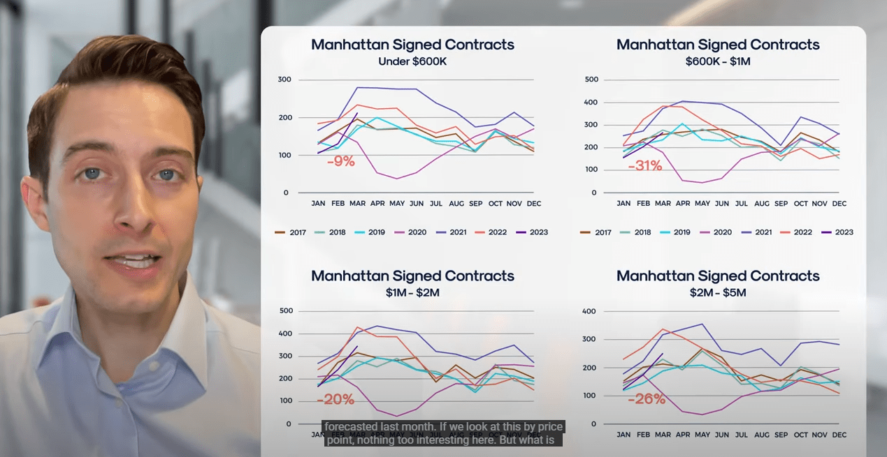 Hey everyone this is James at Yoreevo, New York's #1 commission rebate brokerage with our March 2023 Manhattan Market Update and we have a couple of interesting data points to relay this month. First on sales: if you just look at the headline level of contract activity, it's doing what we thought it was going to do. The year-over-year declines are narrowing because the comps are getting easier. However, well actually, before we get to that. You can see here this is the year-over-year chart. You can see down 22%, smaller declines, all as expected as forecasted last month. If we look at this by price point, nothing too interesting here. But what is interesting is if we compare to the 2017 to 2019 average level of demand, which is what we use as a proxy for normalized demand. We are now up. We are up 13% compared to that level of normalized demand and this is the first increase since September. So you can see in this chart, the market weakened all as we went through 2022. It troughed in the fall as kind of that interest rate shock was at its maximum point. And then buyers seem to be adjusting and we're seeing pretty robust levels of demand out there. And if we look at inventory, there isn't any good news for buyers there either because inventory is up just 1% and we have been bouncing around that flattish level of demand for the last six or nine months, but this is actually a reversal of what we have been seeing the last couple months. It had ticked up a little bit of 3-4% now we're back up to 1%. So basically for all the buyers who are out there, they're seeing more more activity on the buyer side and less supply on the seller side. So the buyers who are in the market have to fight over the listings that are available, which theoretically should push up pricing. I wouldn't get carried away and say that's happening yet, but the ingredients are there for a pretty strong selling season for sellers. Not as strong as last year, certainly not, but it's much improved versus the market that we were looking at in the fall. If we look at inventory by price point, basically the lower the price point, the less inventory there is. And we also wanted to look at mortgage rates again that's as we do every month. Nothing too interesting on this chart, just revisiting it. The Fed raised a quarter of a point last week. Mortgage rates didn't really do that much but what I did think was interesting is because of the bank failures, we've seen the 10 Year Treasury come down quite a bit. And this is a very long term chart here but you can see the 10 Year Treasury in purple here. 10 Year Treasury has come down quite a bit. Mortgages have come down but not too much and this just brings up a broader point where the spread between the 10 Year Treasury and 30 Year Fixed Rate mortgages is elevated and this is going back to 2014. You can see from 2014 to 2020, so a six year stretch. The spread between the the two rates was pretty consistent. Didn't really move much at all about 1.75% and then with all the uncertainty around COVID, it blew out. It went up to, let's call this, 3% before normal rising again but we're back not only to those levels. We're actually pretty much at the highs. So for anybody tells you what interest rates are going to do, what mortgage rates are going to do, they're usually just making it up. However given the spreads are elevated, the long term trend would pull mortgage rates down assuming that the 10 Year Treasury rate doesn't move, I wouldn't adjust your search because of that. But that is a potential tailwind for the market going forward. If these spreads were to normalize, so this is getting a little in the weeds. This is from our Fed rate blog post which I'll link to in the description, which is pretty good and goes into this in in more detail. But of course if you want to learn more about how how the interest rate market works, if you want to learn about the New York City real estate market, if you're thinking of buying, obviously we'd be happy to help. We can get you a commission rebate for up to 2% on any property in New York City. We're happy to slice this data however you like to cater to your specific search. So thanks for watching. We will see you next month, bye.