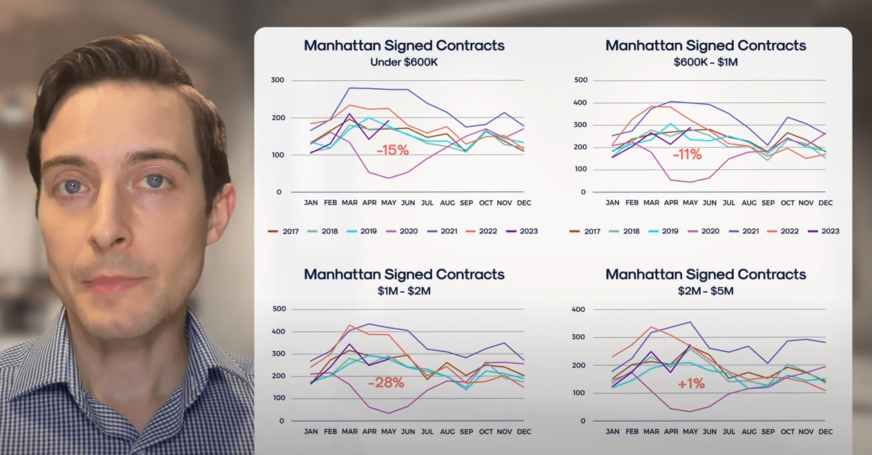 Hey everyone, it's James at Yoreevo - New York's #1 commission rebate brokerage with our May 2023 Manhattan Market Update. And if you remember the last couple months, we've seen a lot of volatility. March was very strong. April was quite weak, but May picked up right where March left off. On a headline basis we were down 12% in terms of the number of contracts that were signed versus last year. But remember the comparisons last year are lumpy and they ease significantly as they go throughout the year. So what we like to do is compare to the 2017 to 2019 average. And compared to that, we are up 9% and that's just shy of the increase of 12% that we saw in March. So when we look at the chart here, you can see very strong March, big step back in April, and quite a big rebound in May. And we can't point to anything specific as to what might be driving this. It could just be, well I guess it is, just quirks of the data, because remember last month we said we weren't really seeing it in our business, and this kind of shows that April was more of an aberration, and the market remains quite strong. The high end is particularly strong if you look at the breakdown by price point. We actually saw an increase of 1% in the $2-5 million range. That's still well below where it was in 2021, but a very strong showing nonetheless. And this is comparing current demand to the 2017 to 2019 average, which is what we consider normalized levels, so we're above normalized levels of demand in the Manhattan market right now. When we look at inventory, same boring story there, we're up just 1% year-over-year. This is basically unchanged since August. So we're coming up on one year of basically no change in inventory on a year-over-year basis. I could be wrong, but I think every month since then, it has been within 2% of the previous year's levels. So very boring and that's what's supporting the market, because buyers just don't have that many choices to make. And so there's a bit more urgency when buyers see something that they like. And this is all in spite of higher mortgage rates, which we'll get to in a second. You can see here just the purple line is tracing last year's levels, really no change there. By price point there's some variation, but really nothing too material. And then on mortgage rates they are drifting higher so this is all in the face of higher mortgage rates. And you can see here, it's been drifting up. I had a buyer just this week who said that one of the big banks was quoting her 7%, which just a month or two ago would have been insane. I saw one person get a quote under 5% back in, might have been in February. It was for an adjustable rate but still a very attractive rate nonetheless. And after some shopping, the rate was generally in the called 6.5% to 7% range, so mortgage rates are basically back to the highs and the market is very strong. Buyers just seem to have so much pent-up demand. They're so eager to make the purchase that maybe they postponed for a year. That they're really moving forward with determination on the choices that they do have out there. So pricing wise, I'd say we're probably flat-ish over the last year. It's going to vary a bit. So like always you can contact us and we're happy to talk about your specific search. Slice this data however you like. Obviously help with your search and get you a commission rebate for up to 2%, but it really depends on where you're looking, what price point you're looking at, what property type, and a lot of other factors. So feel free to reach out to us at info@yoreevo.com and we'd be happy to help. And thanks for watching, bye.